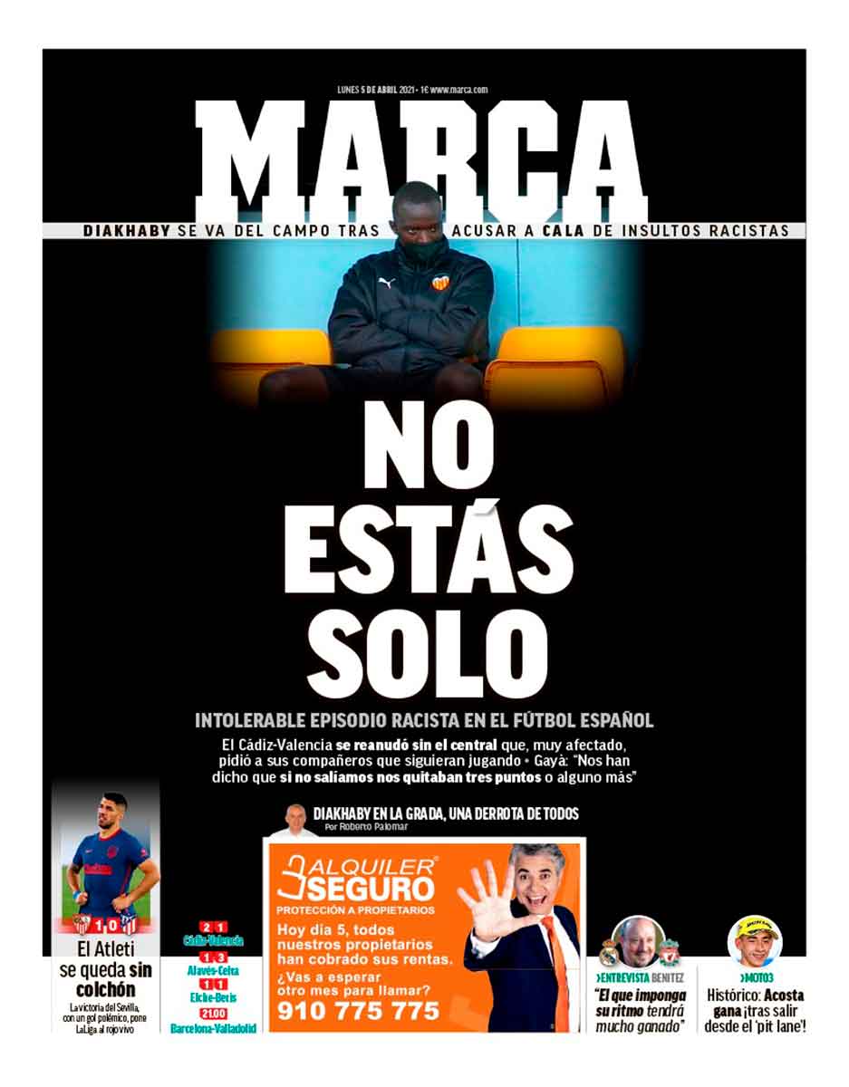 ¿Recordáis la primera plana de Marca tras los supuestos —porque no había imágenes ni audio de ellos— insultos racistas del jugador del Cádiz Cala al futbolista del Valencia Diakhaby? Si no os acordáis de ella, os la rescatamos: