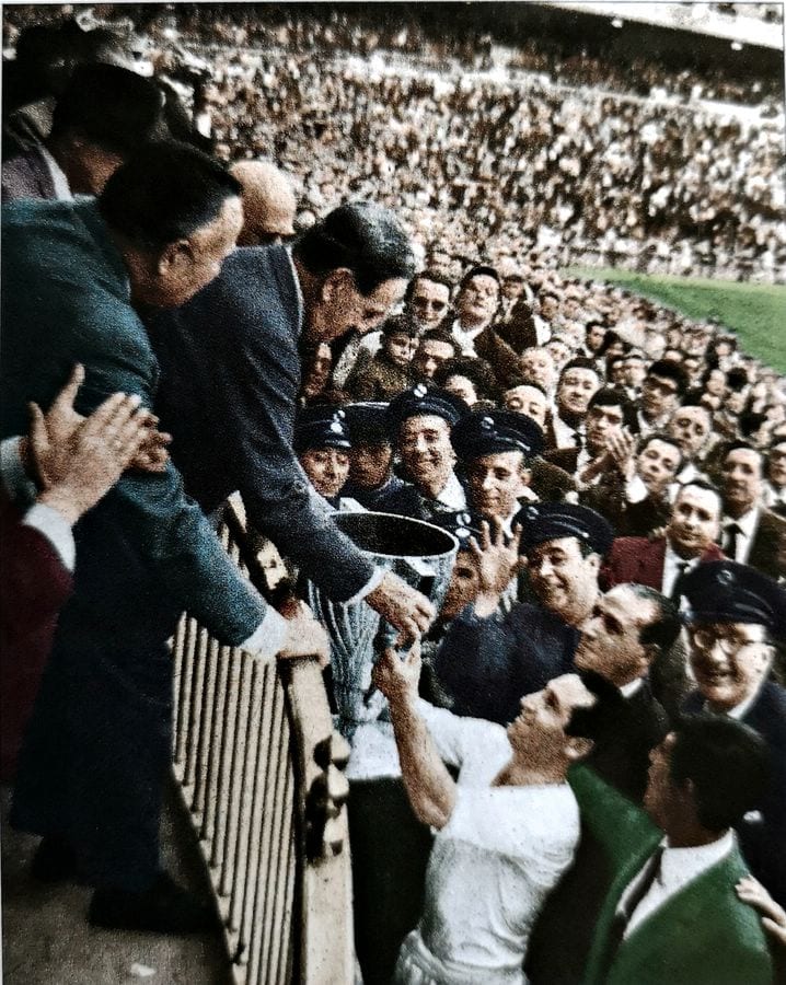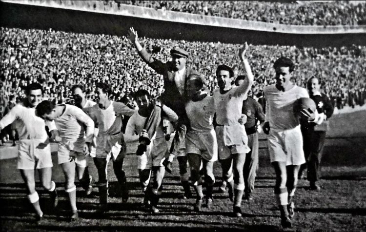 3ª Liga. 18/4/1954 Estadio nuevo Chamartín (Madrid). La sequía se rompió tras 21 años y la Liga volvió a ser blanca gracias a la llegada de Alfredo Di Stéfano. El equipo dirigido por Enrique Fernández se escapó en la segunda vuelta y fue superior al Barcelona al que venció 5-0 en casa. El alirón tuvo lugar en la jornada 29 tras ganar al Valencia 4-0 en una tarde excelsa de ‘La Saeta Rubia’.