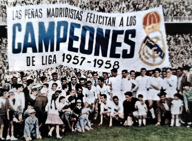 6ª Liga. 27/4/1958 Estadio Metropolitano (Madrid). El argentino Carniglia fue el timón del equipo desde el banquillo tras la salida de Villalonga. Los blancos pasaron un ecuador de temporada bastante difícil en cuanto a resultados, pero cuando llegaron los momentos cruciales recuperaron su enorme categoría. Otra vez el Metropolitano asistió a un alirón merengue tras un empate a uno en la penúltima jornada.