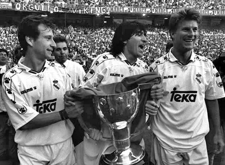 25ª Liga. 15/4/1990 Estadio de Zorrilla (Valladolid). La Liga de los 107 goles. El quinto trofeo de ‘La Quinta del Buitre’ que de esta forma igualaba la racha de inicios de los años 60 en el club de Chamartín. Toshack no se acopló de manera perfecta al vestuario, pero construyó un equipo fantástico. El alirón fue en la jornada 34 en Valladolid donde se empató a cero y apenas existió celebración.