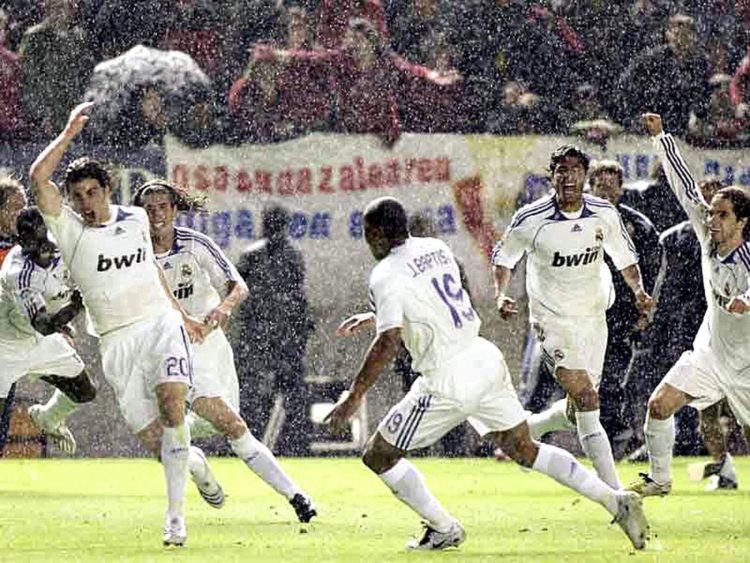 31ª Liga 4/5/2008 Estadio Reyno de Navarra (Pamplona). Schuster fue el elegido como nuevo capitán del barco tras la marcha de Capello. Con el alemán se jugó un buen fútbol y los merengues demostraron ser superiores a todos sus rivales. El alirón, con una remontada sensacional, se produjo ante Osasuna con dianas de Robben e Higuaín. Tres días más tarde hubo pasillo del Barça en el Bernabéu.