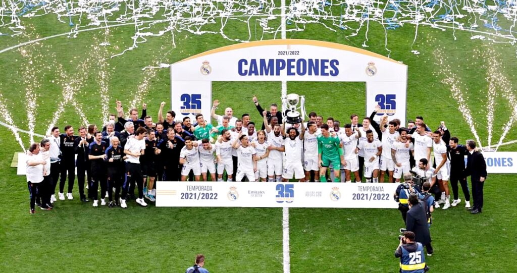 35ª Liga 30/04/2022 Estadio Santiago Bernabéu (Madrid). La primera Liga de Carlo Ancelotti en el Real Madrid llegó en su segunda etapa como técnico blanco. El dominio merengue en la competición doméstica fue abrumador alcanzando el primer puesto de la tabla en la jornada tres y manteniéndolo hasta el final. Benzema y Vinicius con su acierto goleador guiaron al Real Madrid al título que conquistaron de forma automática en la jornada 34 contra el Espanyol al que vencieron por 4-0 (Rodrygo 2, Asensio, Benzema).