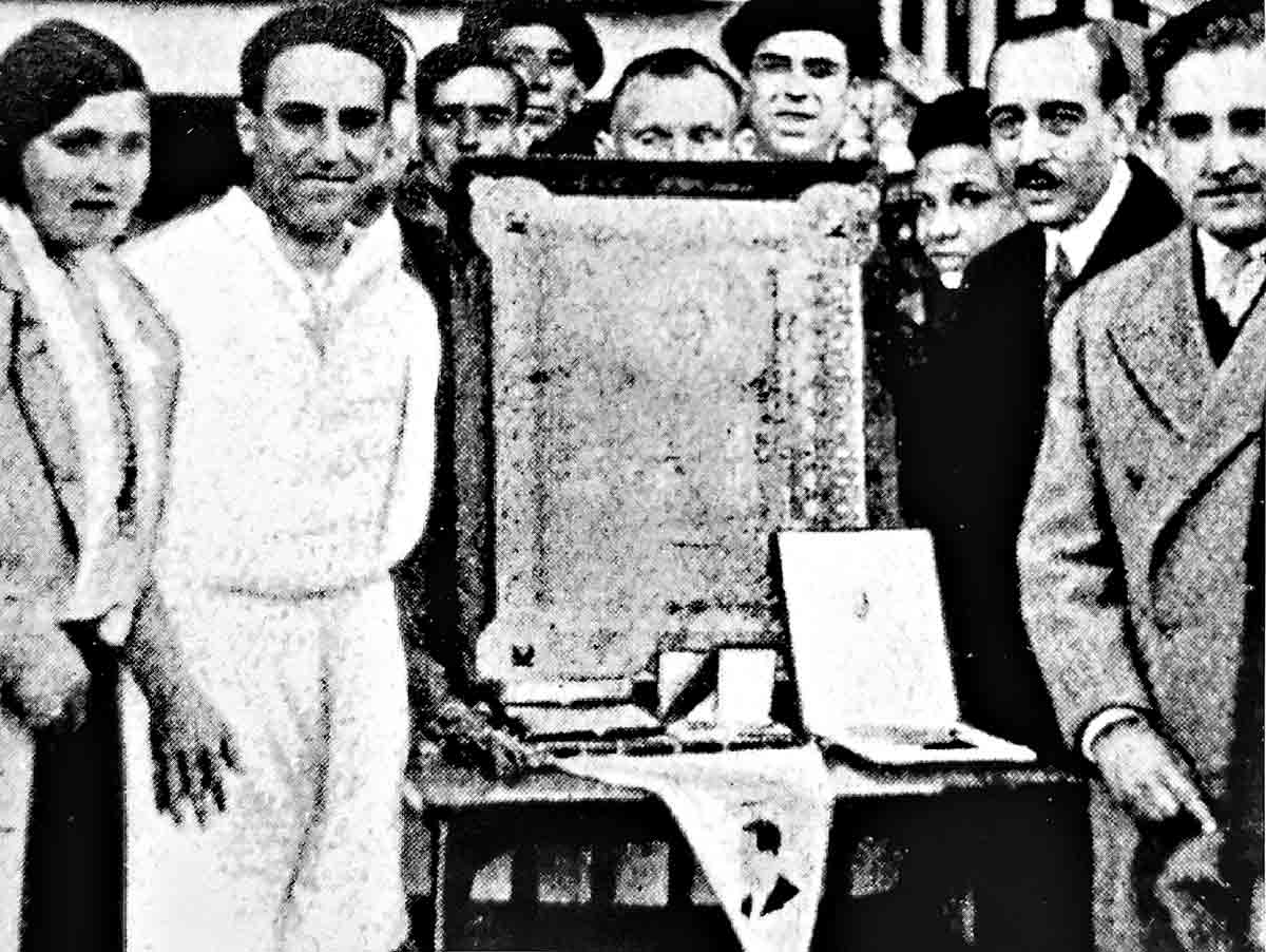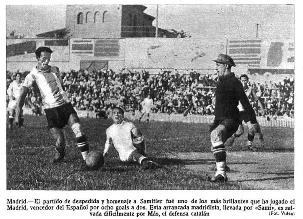 Josep Samitier, fue toda una institución en el F.C. Barcelona, una de las primeras estrellas del fútbol español y un personaje muy influyente en el balompié nacional. En 1933 tras unos problemas con la directiva culé y convencido por su amigo Ricardo Zamora aterrizó en Madrid para firmar por la institución merengue. Su paso por el Madrid F.C. fue breve y apenas duró una temporada y media donde alcanzó una Liga y una Copa, pero dejó huella tanto en el club, como en sus compañeros y aficionados y en la primavera de 1934 se le rindió un partido homenaje y de beneficio antes de su eventual retirada. El 13 de mayo saltaron Madrid F.C. y el CD Español a Chamartín con un lleno completo en las gradas. Por los blancos se alinearon Zamora (Cayol 45’); Quesada, Maciá; P. Regueiro (Sauto 45’), Bonet, Gurruchaga (Valle 45’); Lazcano, L.Regueiro (Olivares 45’) Samitier, Hilario y Eugenio. El choque fue un festival anotador que se llevó el equipo de Paco Bru por 8-2 con dos goles de Eugenio y Samitier, uno de Hilario, Luis Regueiro, Olivares y Lazcano. El diario ‘Luz’ explicó que el Madrid “realizó un encuentro magnífico de resultado y espléndido de forma”. También el medio tuvo grandes palabras de elogio a Samitier: “Muchos fueron los momentos en que el buen delantero catalán lució toda la gama de sabiduría, impregnada unas veces de valor, otras de habilidad y siempre del dominio que solo es capaz de poseer un jugador de gran clase. Consiguió dos tantos, el primero y el último de la tarde, modelos de habilidad y colocación. El público, satisfecho de su actuación, no escatimó su aplauso en muchos momentos, tributándole una ovación clamorosa cuando, al término de la jornada, se retiraba a la caseta, visiblemente emocionado”.