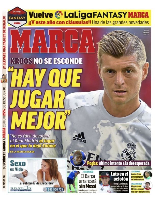 4. Jejejeje la portada de Marca es una entrevista de Toni Kroos a otro medio jajaja. La entrevista que concede Kroos a la revista Kicker ¡es la portada del diario más vendido en este país!. Jajajaja Insisto, no es una entrevista suya, ni una sola pregunta es de Marca, jajaja cogen la publicación de una revista alemana de fútbol , Kicker, de una entrevista a Toni Kroos sobre su reto con la selección alemana para 2020 y claro, un poco de actualidad de su Realmadrid y va a la portada de Marca. Jajaja jajaja jajaja todo vale, señores, jajaja cualquier cosa q lleve la palabra Realmadrid justifica el relleno. Han perdido la vergüenza torera, el amor propio, porque la gallardía, la dignidad y el buen hacer se lo dejaron en esta travesía sin fin de indigencia moral e intelectual.