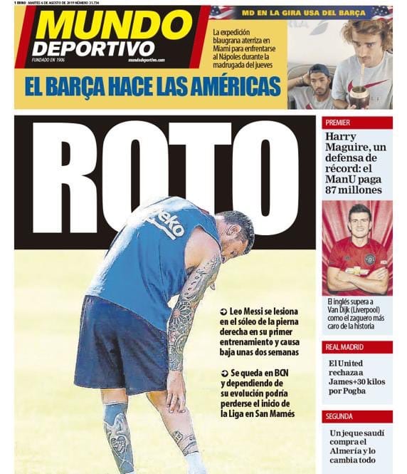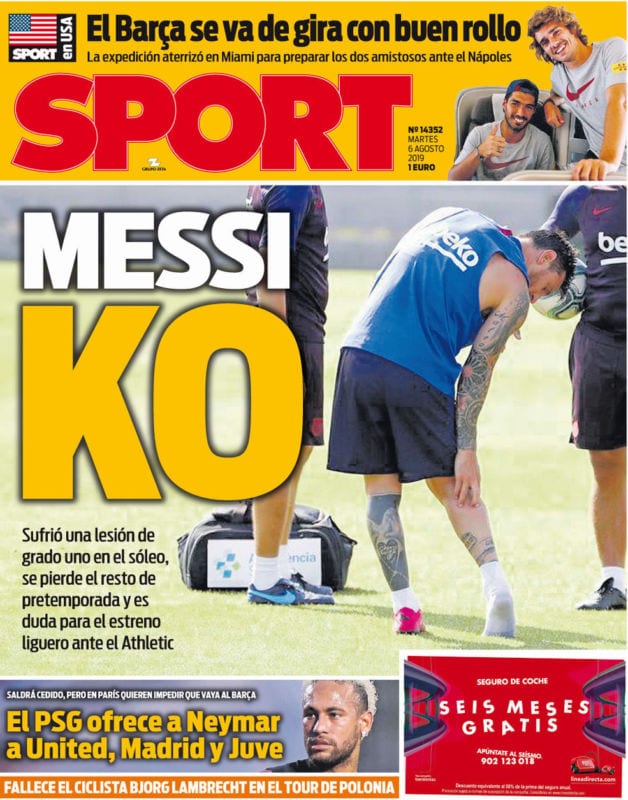 Para la prensa cataculé, entretanto, la noticia está como no podía ser menos en la lesión muscular de Messi, que le pone en jaque prácticamente para toda la pretemporada (ánimo, Leo, las lesiones siempre lejos, hasta del rival o sobre todo del rival), aunque Sport tiene espacio para el asunto Neymar, culebrón inacabable del verano que lo mismo puede dar con los huesos del carioca en Can Barça que en en Valdebebas que en el Monasterio de Santa María del Parral (Segovia).