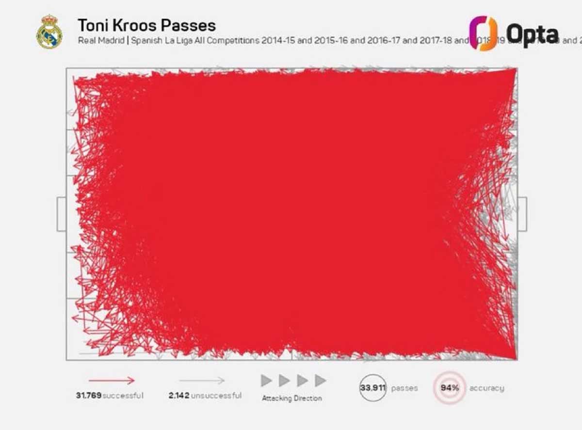 No voy a hablar del Kroos jugador, pues todos le conocemos desde hace demasiado tiempo y sería redundar absurdamente en nuestros recuerdos. Y francamente tampoco es cuestión de meter el dedo en la llaga sobre lo que estamos perdiendo sobre el campo. Os dejo su mapa de pases para que quien quiera autoflagelarse lo haga bien a gusto