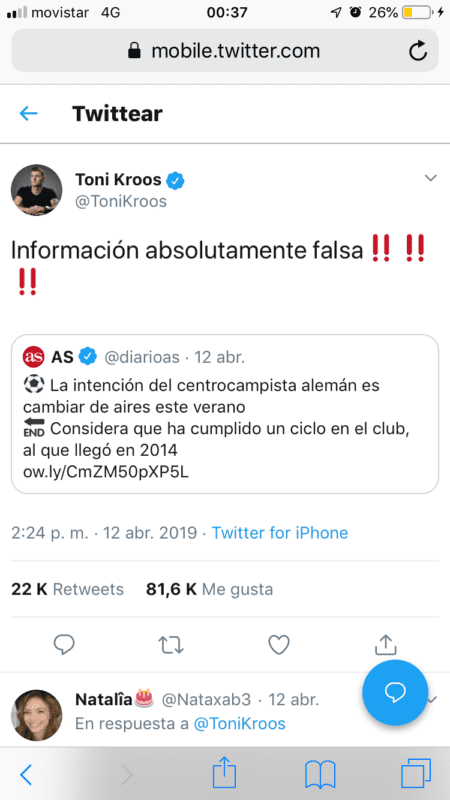 Según este trino del ínclito Ouija Daily, Toni Kroos se iba del Madrid. Lástima que el propio interesado no tardara en reaccionar al bulo.