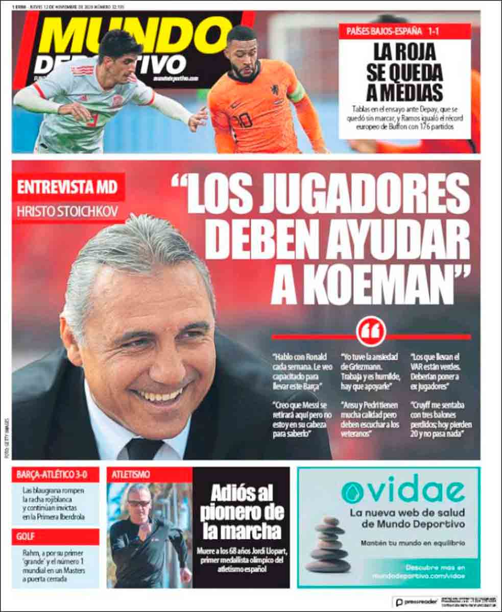 La Ouija sigue los pasos de Marca en cuanto a fervor patrio, aunque lo haga mediante una selección de imagen de fondo para su primera plana que evoca un saludo, no en el Amsterdam Arena, sino más allá de la Cúpula del Trueno. Sin lugar a duda, un contexto ideal para ilustrar portadas en tiempo de contagios, infectados y pandemias.