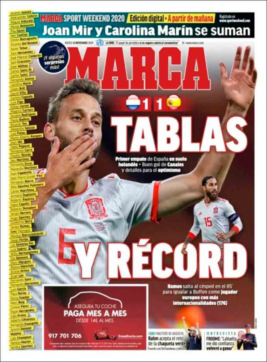Así las cosas, Marca refleja a todo color el empate cosechado por España en Flandes entre los confetis por una nueva marca de Sergio Ramos camino de romper todo registro. Poco más que añadir en portada. Es lo bueno de los parones de selecciones. Que tampoco tienes que romperte mucho el coco. Basta con apuntar que hace la cosa Roja y a vivir que son dos días. Otra cosa pasa por preguntarnos de dónde saca petróleo al alba el portanalista para conseguir que ustedes, amigos galernautas, esbocen una sonrisa de buena mañana.