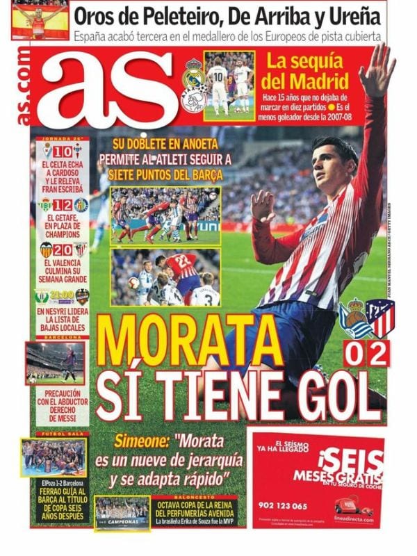 Pero As, nuestra entrañable Ouija, no se conforma con girar hacia el Atleti, sino que justo antes de virar la cabeza en la otra dirección suelta un filardo extemporáneo al ojo de los de Concha Espina. “Morata SÍ tiene gol”, nos sueltan. ¿Por oposición a alguien que en cambio no lo tiene?, nos preguntamos anhelantes, por cuanto el raciocinio no nos da para tanta sutileza. A ver si se van a estar refiriendo al Madrid.