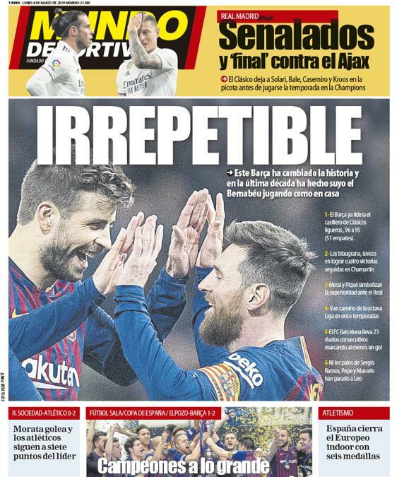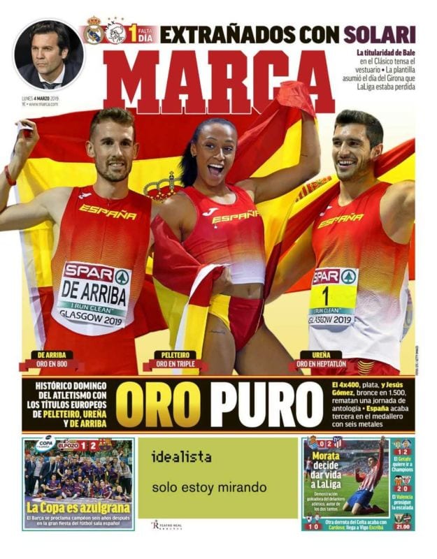 Marca, por su parte, en lugar de jugárselo al comodín del Atleti se lo juega al comodín de “varios”, donde está el atletismo y donde hoy hay razones para la exaltación patriótica. Tampoco nos parece mal, si bien no se descuida un pequeño espacio superior para hablar de la “extrañeza” que genera alguna de las decisiones de Solari. ¿Qué no genera extrañeza en el Madrid ahora mismo?, nos preguntamos. El Madrid es ahora mismo, especialmente para quienes lo amamos, un puro extrañamiento, un no reconocer, una esperanza que se resiste a morir pero a la cual parece darle apuro ser: la esperanza del martes, la esperanza de la Champions.