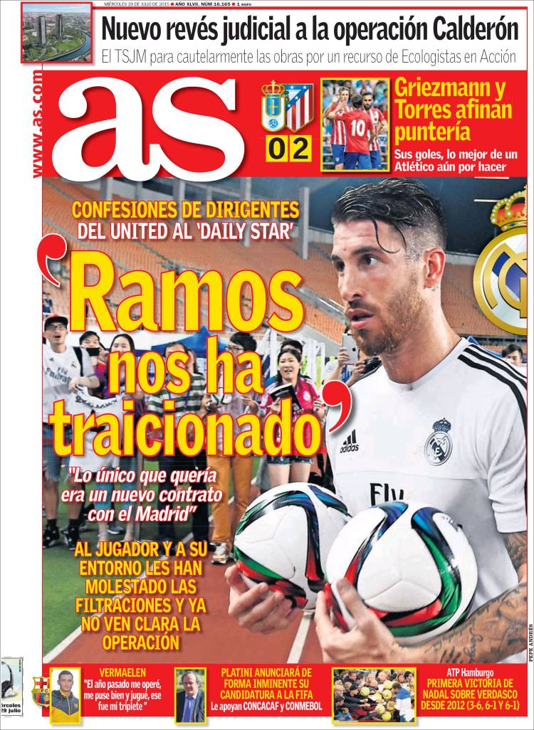 La sensación, pero no nos hagan mucho caso, es que As pretende tranquilizar a todo el madridismo respecto al asunto Ramos a base de decirle al madridismo que Sergio Ramos podría ser un traidor. Si los del Manchester se sienten traicionados, ¿será porque por fin Sergio se queda? Lo que tranquilizaría al madridismo, en este momento, no son especulaciones de portera (o, lo que es peor, especulaciones de uno de los más deplorables tabloides británicos), sino que el asunto Ramos se resolviese de forma razonable, bien con una renovación al alza que tuviera en cuenta el coste de oportunidad sufrido por Sergio al no jugar en mercados más halagüeños fiscalmente -pero (atención) también sus escasos méritos recientes y su edad-, bien con una ruptura definitiva de las negociaciones que permitiera al Madrid mirar adelante en pos de una desinversión jugosa y un reemplazo de garantías.