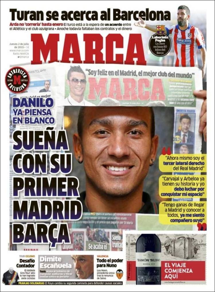 Hay que reconocer que hoy la Central Lechera responde a nuestra petición de árnica ante este muy aciago comienzo de verano. Marca se hace eco de lo de Arda pero nos ayuda un poco a restañar las heridas con la prometedora entrevista a Danilo, quien amén de ser un extraordinario jugador demuestra saber cómo se gana uno a la parroquia desde el minuto uno. "Ahora mismo soy el tercer lateral derecho del Real Madrid". Que él mismo crea (o no) en la veracidad de sus palabras es casi lo de menos. Que haya algo de pose en su actitud humilde no es descartable, como innegable resulta el que al madridismo le guste ver a una primera figura (porque lo es) entrar por la puerta con esa actitud, aun cuando no sea del todo sincera. Son cosas que ayudan a sobrellevar la idea tácita central del portanálisis de hoy, que ya quedó insinuada antes: el Madrid anda despistado en este comienzo de campaña de fichajes, aunque nunca se sabe con Florentino. Puede que solo parezca estar despistado. "Tranquilos, esto no acaba hasta el 31 de agosto", decía un amigo tuitero en el día de ayer. Nosotros vamos más allá: no acaba hasta mayo de 2016. Si suele echarse en cara a Floren el centrar sus méritos en las contrataciones veraniegas, cosechando en agosto efímeras e insignificantes victorias que pocas veces se traducen en éxitos al final de temporada, seamos coherentes con esa acusación, y juzguemos cuando concluya todo, pero todo de verdad.