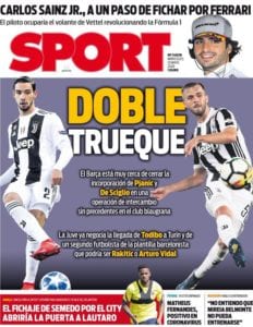 Si la prensa deportiva de la meseta hoy vuela sobre el asfalto, las cabeceras catalanas cuanto menos necesitan una paradita en boxes. Curiosamente la primera plana del diario Sport, que tantos buenos y delirantes ratos nos ha brindado durante esta pandemia, hoy tiene un pase. Vale, sigue enredado en el ciclo kármico de los fichajes blaugranas, este miércoles en fase fenicio en Gran Bazar ofreciendo futbolistas como chorizos artesanos en una feria medieval de un pueblo de Segovia, pero nos vale. Sport viene anunciándonos desde hace tiempo que esto de la economía ya se ha terminado, coronavirus y renovaciones de Messi mediante, y que lo que se lleva ahora es el trueque. Como los cavernícolas intercambiando dientes de mamut por pieles de tigres de dientes de sable, tal y como este portanalista aprende confinado con las lecciones de prehistoria online de mi hija Clarita.