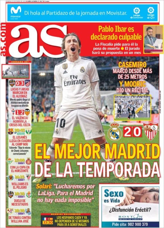 Y de repente, un 20 de enero cualquiera, cuando nadie parecía sospecharlo, se alinea Mercurio con Marte (o Casemiro con Modric) y nuestra querida prensa deportiva se suelta la melena y admite que el Madrid ha jugado un buen partido, incluso ¡el mejor partido de la temporada! (Relaño dixit).