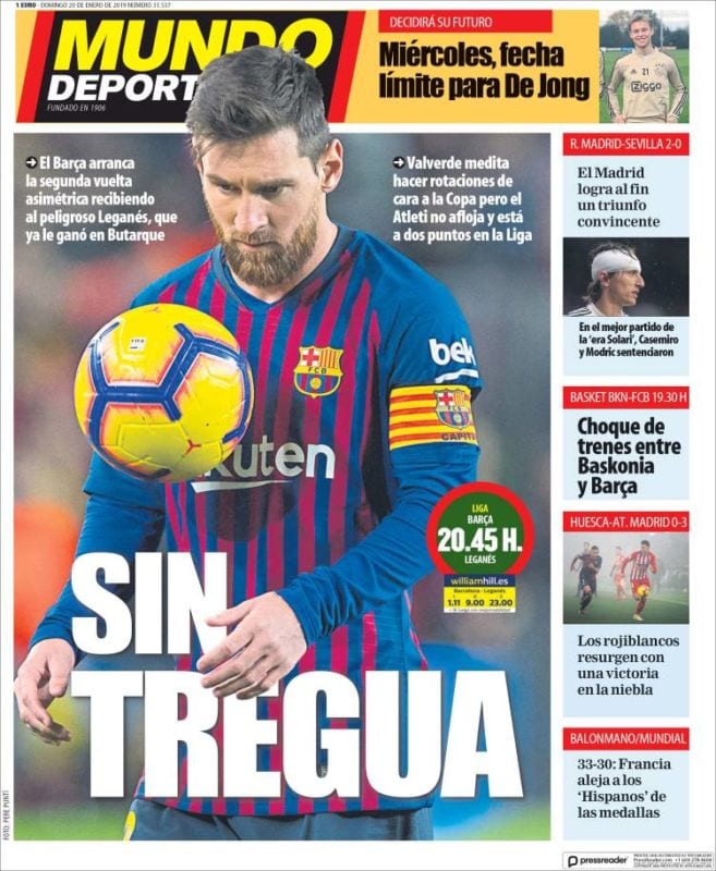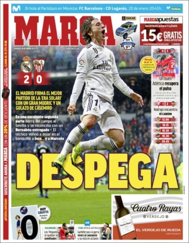 Marca Portada Despega 20.01.19As Portada Mejor Madrid 20.01.19Mundo Deportivo Portada Sin tregua 20.01.19Esto no se hace. Esto no es un domingo ni es nada. El servicio de portanalismo de esta humilde publicación, siempre a su servicio, ya tiene la consolidada costumbre de enfrentarse a discursos bien diferentes cuando pierde el Madrid, cuando empata el Madrid, cuando gana el Madrid e incluso (triple salto mortal, tachán) cuando no juega el Madrid. El portanalista se levanta un domingo y ya la noche del sábado (haya estado donde haya estado el portanalista, haya tomado los espirituosos que haya tomado) ha ido confeccionando en su cabeza las líneas generales de lo que será su análisis mañanero (tenga la resaca que tenga el doliente analista). Suele saber de sobra el esforzado escribiente que alguna mácula habrá, que alguna polémica se inflará, que alguna abuela fumará, que algun rosario habrá estrenado la Aurora... Solo falta abrir los ojos para confirmar que la canción sigue siendo la misma de siempre, aquella triste de Padre Damián Street.
