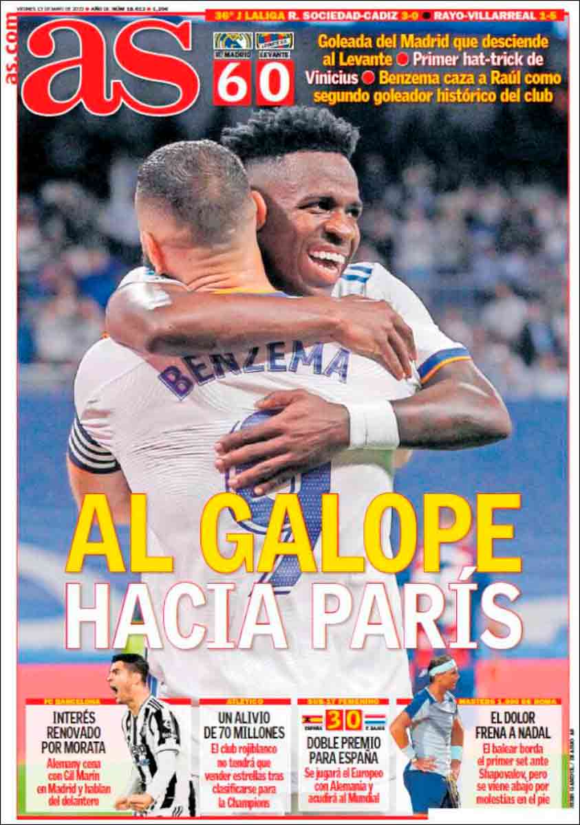 El que firmó un hat trick del otro, o sea, de goles, fue Vinicius jr., a quien hoy se nos ha ocurrido la gracia de rebautizar como Trinicius. No quedó conforme con el doblete que hubiera rubricado Vi(Bi)nicius y se lanzó a por el primer triplete de su carrera en el Madrid. Trinicius jr., que hoy viene a la portada de As abrazado a su inseparable Benzema.