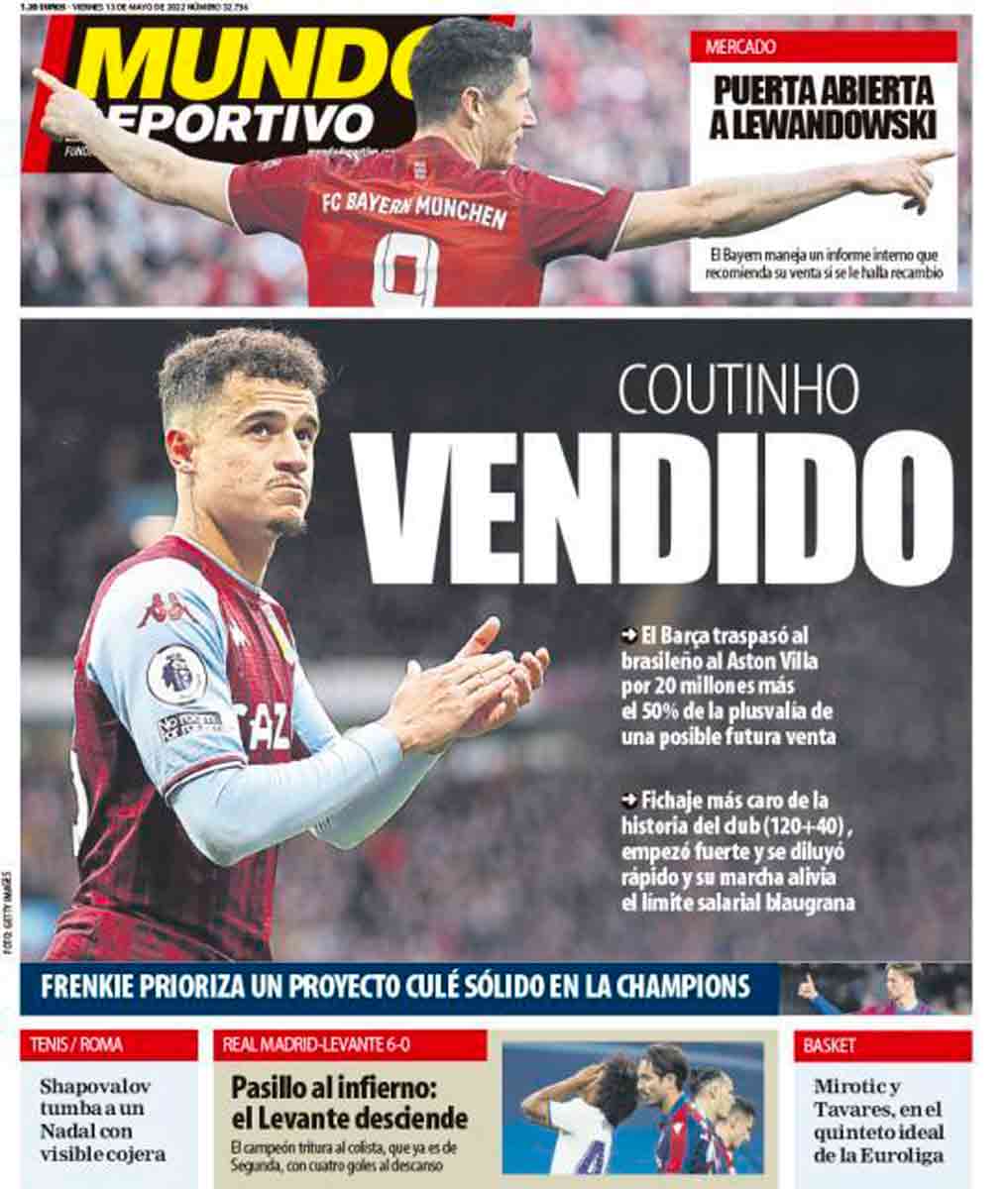 Os dejamos con la prensa cataculé, que se ufana por haber vendido a Coutinho por 20 millones después de haber pagado 120 por él, y que incluso apunta a la venta de Frenkie De Jong, acaso su mejor centrocampista, para impedir que los cascotes del estadio sigan desplomándose y las cacas de las palomas se enseñoreen de la zona de restauración.