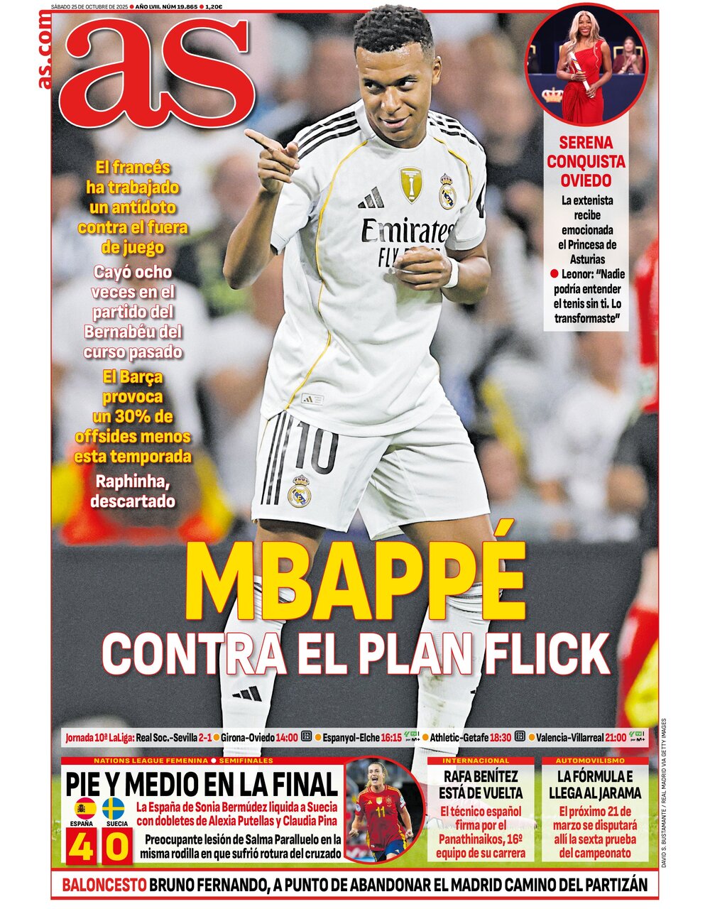 El Kylian Mbappé de esta temporada parece distinto al que cayó ocho veces en fuera de juego en el partido del año pasado, como recuerda la portada. Más certero, más integrado en el funcionamiento de la MLN, como el crack que siempre fue, incluso en los peores momentos del curso pasado. Ojalá funcione ese antídoto que a equipos como el Rayo y el Sevilla les sirvió.