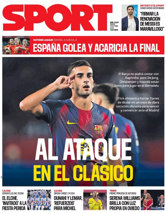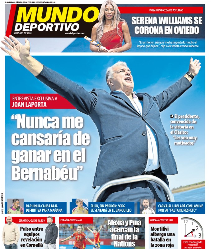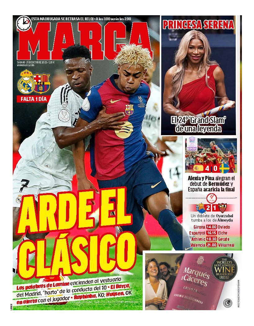 Las portadas de hoy reparten su espacio entre el mal llamado clásico, del que ayer despotricaba nuestro editor, transmutado en el Grinch del clásico, y la entrega del premio Princesa de Asturias del Deporte a la fenomenal tenista estadounidense Serena Williams.
