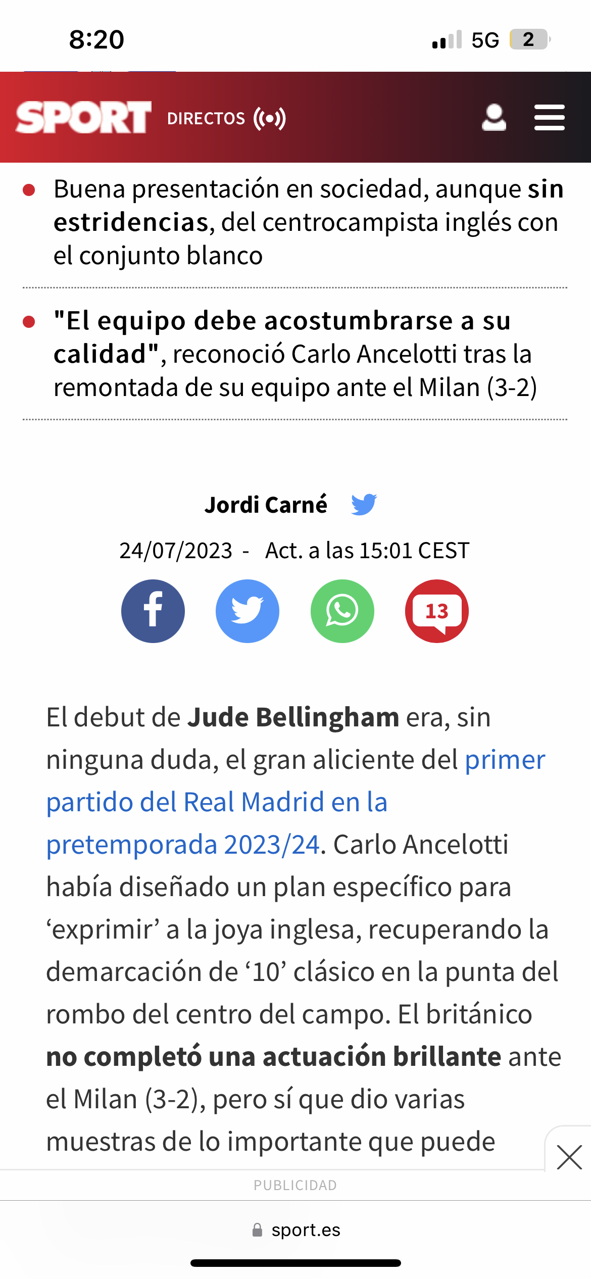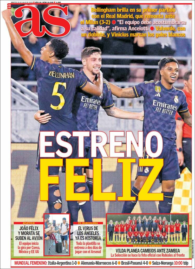 Abajo, en chiquitito, se refiere Sport al debut del Madrid en pretemporada frente al Milan, atribuyendo a la actuación (debut absoluto en este caso) de Bellingham el adjetivo "sorprendente". Nos preguntamos qué tiene de sorprendente el que un jugador magnífico juegue muy bien. Leyendo en páginas interiores, descubrimos que lo que sucede es que Sport no quiere enfatizar demasiado este hecho o, en otras palabras, evita llamar a las cosas por su nombre, Las piruetas circenses de Sport para sortear el riesgo de hablar demasiado bien de Bellingham son descacharrantes.