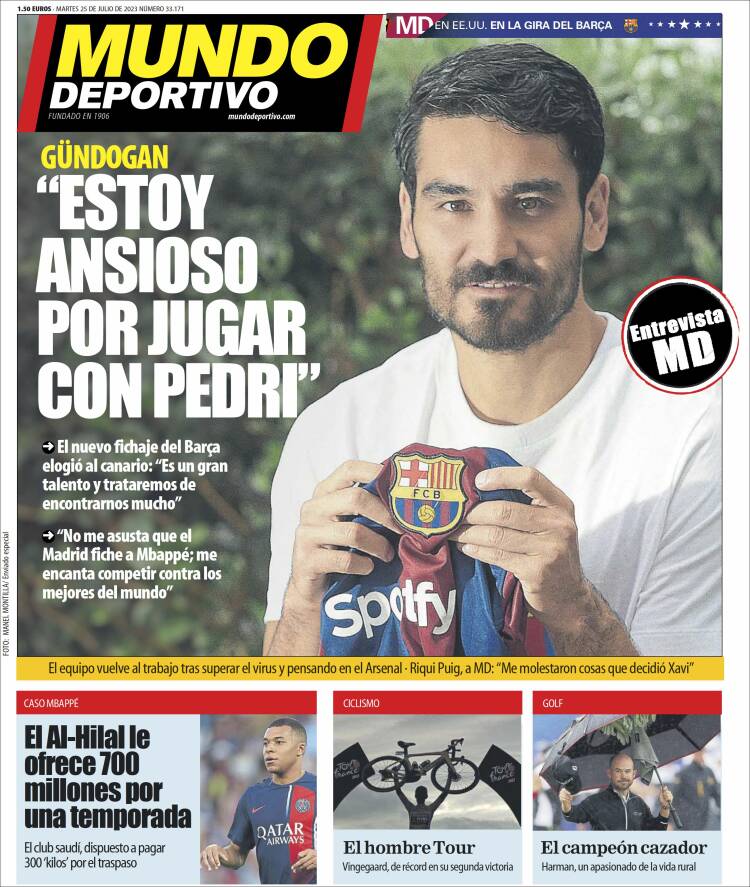 En la portada de la versión impresa del periódico, y si bien el argumento principal es una entrevista con Gundogan, también se refieren a Mbappé, y el mismo rotativo que pregunta online qué jugadores culés cambiarían los lectores por el francés echa por tierra cualquier interés del Barça, atribuyendo además la filtración a la otra parte, es decir, al PSG. "El club blaugrana cree que el PSG les utiliza para presionar al francés". Utiliza, en todo caso, al Barça... y al propio Sport, como hemos visto.