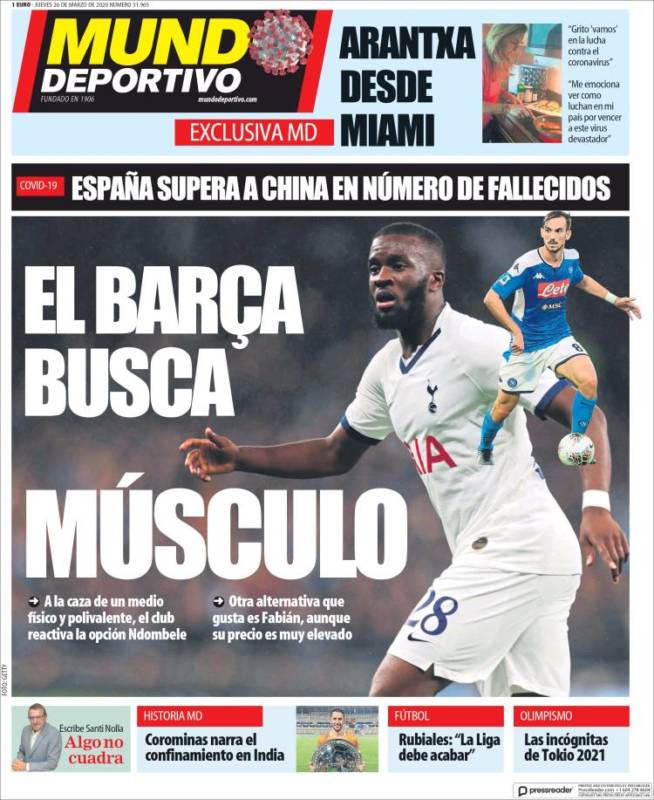 El gemelo de Sport, Mundo Deportivo, también quiere comprar, y habla de Ndombele. De Fabián. Dice que el Barça necesita “músculo”. Músculo financiero es lo que necesita el Barça. Ese tipo de músculo es el que necesitaría haber fortalecido en el gimnasio para optar ahora a todo lo que su prensa dice que quiere. Qué tiempos extraños, en todo caso, estos en los que se nos habla de fichajes en medio de un campeonato deportado al limbo por una enfermedad devastadora. Fichajes que no solo no van a tener lugar ahora, sino que tampoco tienen ninguna pinta de ejecutarse en verano.