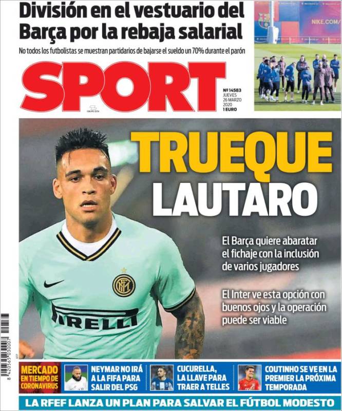 Pero el grueso de la portada va para el deseado fichaje de Lautaro. Lo que tiene de muy fastidioso querer fichar a alguien es que suelen pedirte dinero a cambio de ello, y no todo el mundo (otra vez) quiere que te lo abonen en tikitacoins, sino que piden euros, dólares o libras esterlinas. Resta la opción del trueque, que es lo que el Barça se cansa de ofrecer en verano cada vez que quiere incorporar a alguien, habida cuenta de lo poco boyante de su situación pecuniaria. La palabra “trueque” en las portadas cataculés nos sabe a playa y a salitre, asociada por siempre su aparición al verano y los rumores, aunque sea a este marciano verano de marzo que nos regala la pandemia. Son esos trueques que Sport anuncia a bordo de un cuatro  latas y con un altavoz por las calles del pueblo, logrando solo despertar a los lugareños de la siesta y ponerlos así de peor leche todavía. “Hay trueque, oigan, hay trueque por Lautaro”. Ya habéis supuesto lo que pasa: que no todo el mundo quiere tampoco hacer un trueque por Lautaro, muy en particular el Inter de Milán, que es quien interesa mayormente. Confiamos que se entenderá el intríngulis: de poco sirve que el Sporting de Gijón o el Lokomotiv de Leipzig den al Barça su visto bueno a un trueque por Lautaro cuando Lautaro no juega ni en uno ni en otro club.