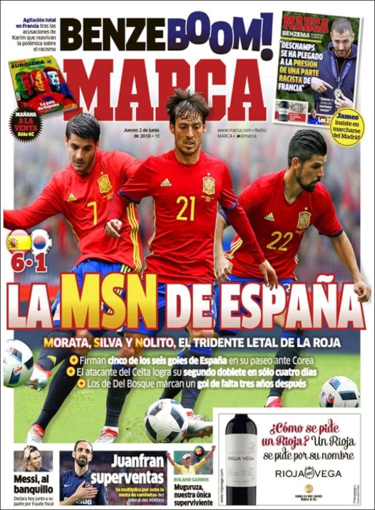 Lo de la prensa es sonrojante "Tridente letal" "Nolito y Morata para soñar" esto en un partido amistoso y ante una selección como Corea que prácticamente se metió sola 2 de los goles y ofreció una imagen de equipo de cuarto o quinto nivel. Luego se ponen muy exigentes cuando el Madrid juega contra equipos como el City o el Wolfsburgo , ambos segundos el año anterior de dos campeonatos de primer nivel.