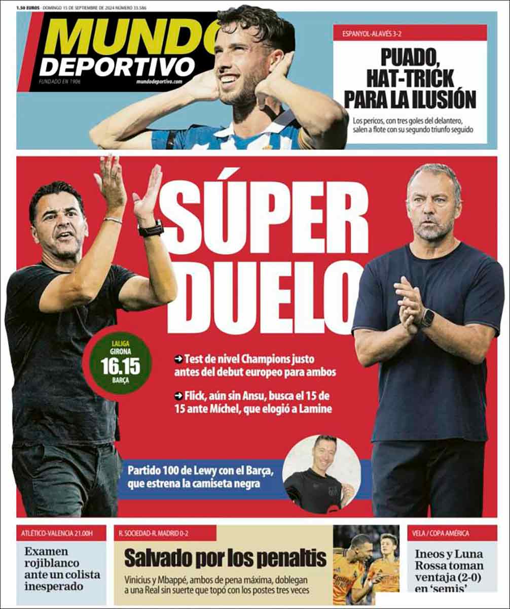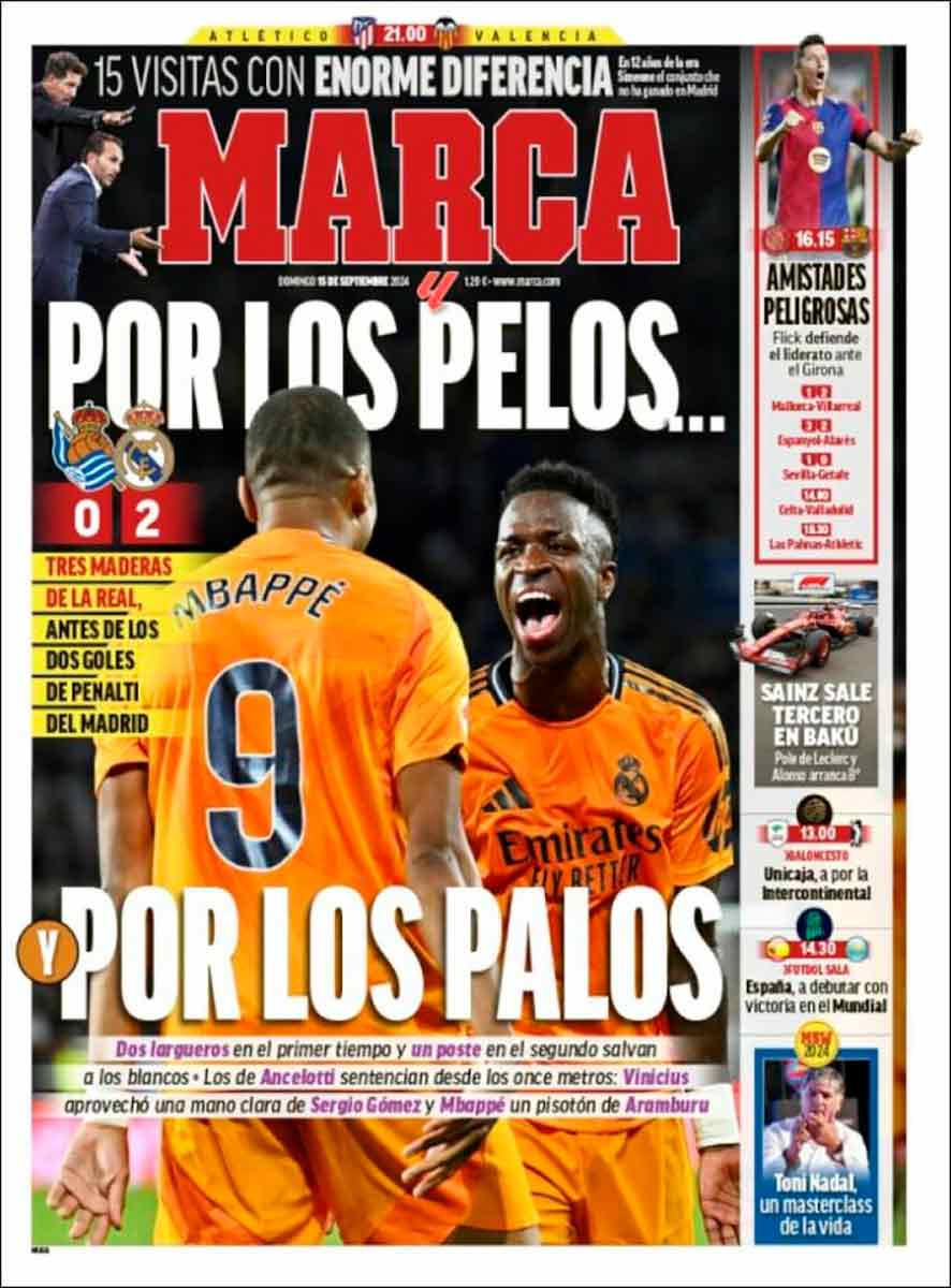 Marca titula «Por los pelos… por los palos», con una imagen de Mbappé y Vinícius debajo de los puntos suspensivos. No, Marca, el Madrid ganó porque marcó dos goles y la Real Sociedad, ninguno. Los palos no son goles, si fueran goles, el equipo que alberga en su estadio a neonazis con dos asesinatos a sus espaldas, el club apropiado indebidamente por sujetos (compañeros de barbacoa) a quienes cedéis portadas plañidera, quizá hubiese ganado alguna Champions.