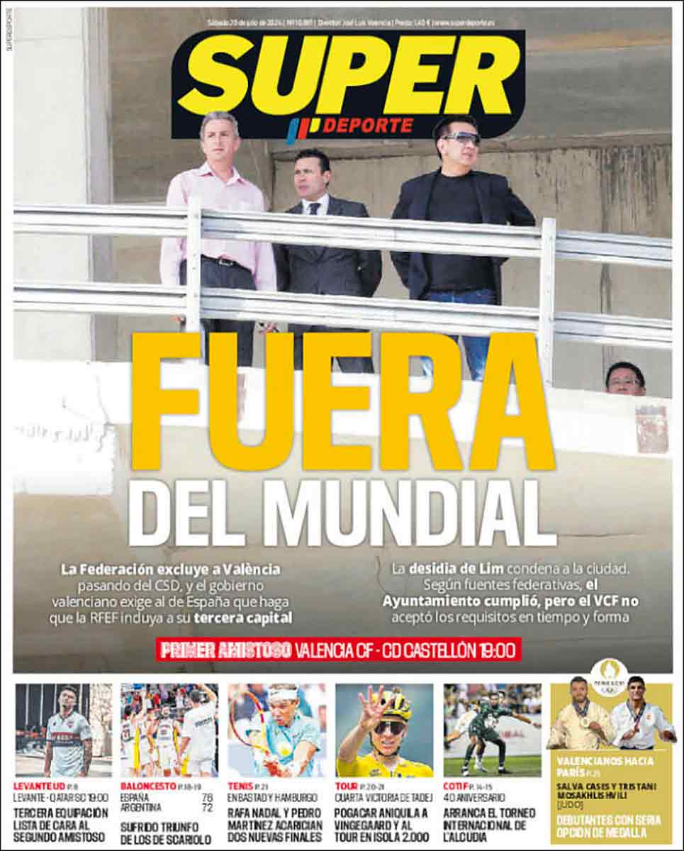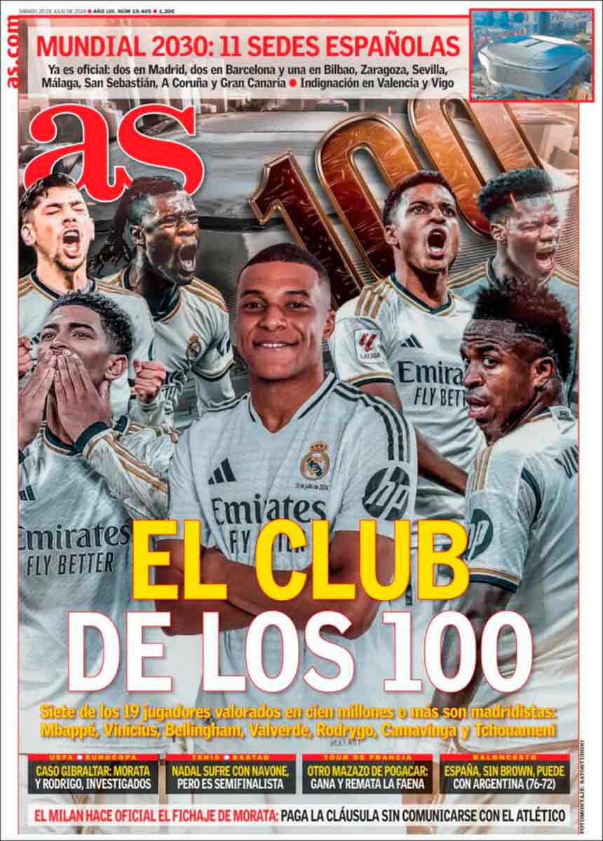Sin abandonar el angosto desfiladero por el que nos conduce la prensa deportiva de la meseta, nos detenemos en la primera plana de un diario AS que erige portadas con datos de Transfermarket y/o tuits de vendedores de crecepelo. Tan mal no lo estará haciendo el Madrid en cualquier caso con tanto jugador valorado en más de cien kilos en el seno de la plantilla. El año pasado nos dijeron que con Joselu —o Ramontxu como dice mi señora— no íbamos a ningún lado. Este año nos dicen que sin Leny, Yoro. Nada más lejos de la realidad, como demuestra el AS con su portada de Club Bilderberg que asimismo desliza entre las sábanas del lector otra serpiente de verano, la designación de sedes mundialistas para el Mundial 2030. Hablamos de un áspid concretamente si usted es un lector valencianista, que no creo, pero que si lo fuera le recomendamos salir corriendo.