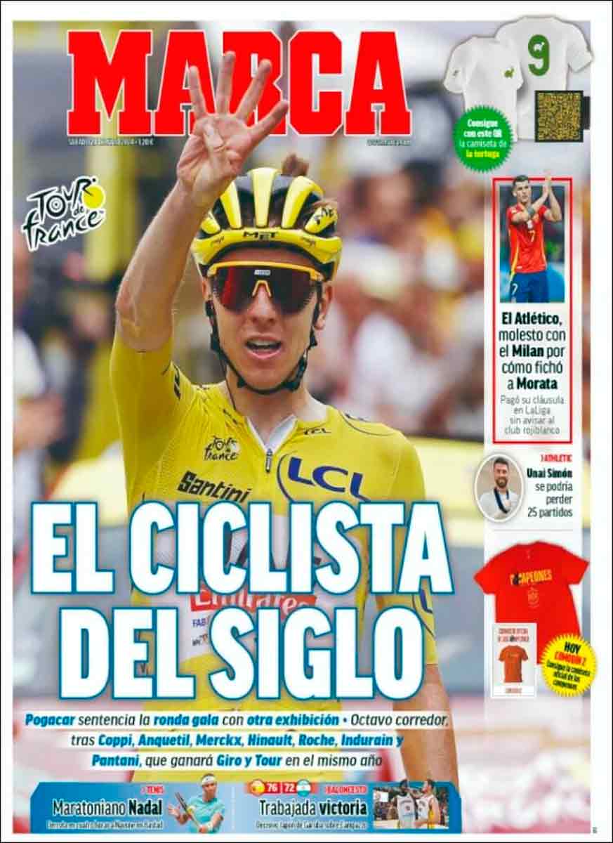Siempre es buen momento para tirar de manacorís o bicicletas cuando la pelotita no rueda. Incluso aunque el ciclista sea esloveno, que uno ve la primera plana marquista —que diría ExclusInda— y piensa que Tadej es Miguelón o Perico. La victoria de Pogacar en La Grande Boucle salva en cualquier caso una portada insulsa en la que la cutre camiseta galápaga compite con el hecho de que el Milán no llamó a nadie del Atleti para depositar la clausula de Morata. Incomprensible que en Milanello nadie quisiera disfrutar de la socarronería campechana y mundana de Henry Cherry, Enrico Ciliegio en tierras transalpinas.