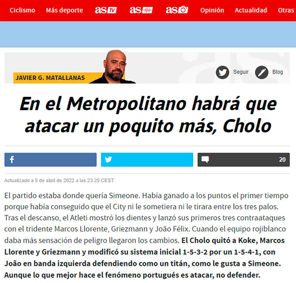 El hecho es que ganó el City porque Guardiola siempre lo hace todo bien, y perdió el Atleti a pesar de que el Cholo nunca hace nada mal. Si acaso, por poner un minino pero, se le puede pedir por favor a Diego Pablo que ataque un poquitito, pero que muy poquititito más. Ya se lo dijo en As Matallanas, con la acostumbrada e inalcanzable dureza con que el perioatletismo suele espetar cosas al Cholo.