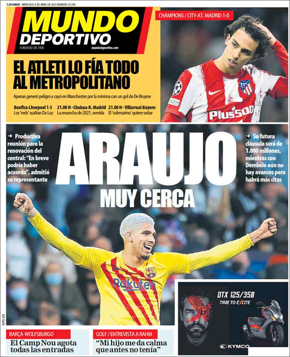 As, por su parte, titula “Ahora le toca al Metropolitano”, descubrimiento sin parangón que ya se conocía desde el día mismo del sorteo, el cual estableció la ida en Manchester y la vuelta en Madrid. Nos enternece que la prensa capitalina atlética (valga la redundancia) ya se abstenga de llamar Wanda al Wanda. Un pez llamado Wanda y un estadio que también, mientras no se arreglen los formalismos que permitan descatalogar de una vez la denominación. El Atleti trata aún de sacar de su capital a los chinos pero por el momento eso sigue siendo Indochina, en feliz denominación de Manuel Matamoros.