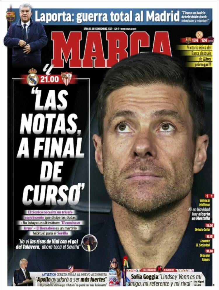 La portada está dedicada, cómo no, al Real Madrid, a su entrenador Xabi Alonso, que esta noche se juega las habichuelas frente al Sevilla, club presidido por José María del Nido Carrasco, ilustre abogado de prestigio, aunque no tanto como el de su padre. El entrenador del Real Madrid pide que se le puntúe al final de la temporada con la base fáctica de los resultados deportivos, no con las pruebas indiciarias de las supuestas desavenencias en la plantilla o en la gestión de los medios disponibles. Las ideas preconcebidas no constituyen una prueba suficiente para cesar o mantener a un entrenador, sino que debemos concluir strictu sensu en base a su capacidad para influir en el resultado de los partidos según sea el marcador al finalizar el encuentro.