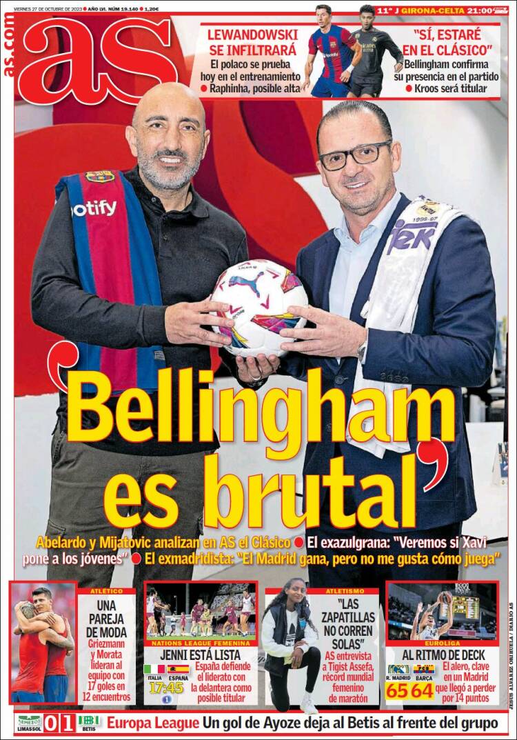 As  ya calienta motores, y para ello reúne en torno al mal llamado clásico a dos exjugadores de ambos equipos (Abelardo y Mijatovic) bajo al titular entrecomillado “Bellingham es brutal”. No sabemos cuál de los dos dice eso, tal vez hay unanimidad y lo afirman ambos. Parece que a Pedja no le gusta cómo está jugando el Madrid. Está en su derecho, faltaría más. A nosotros sí nos gusta, salvo cuando viene un parón de selecciones a estropearlo todo y hay que volver a empezar.