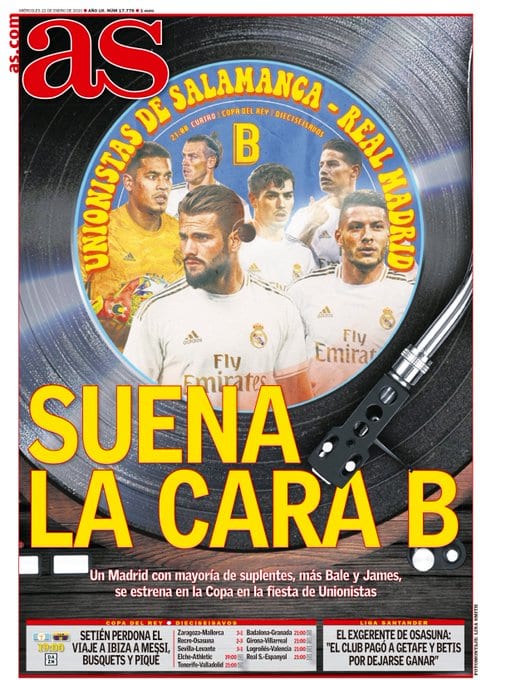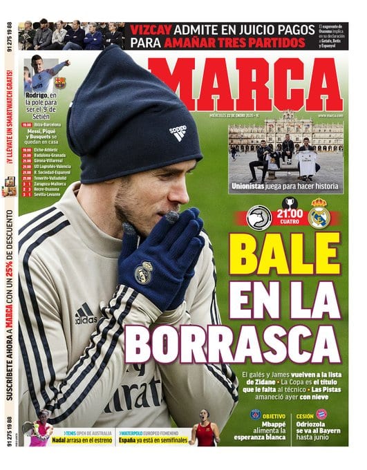 "Bale en la borrasca", titula 'Marca'. Demasiado enigmático. Es como si quisieran golpearlo pero finalmente no hayan ido con todo. Dicho esto, es una portada prescindible, cargada de misterio para dar cobertura a un choque copero en el que el Real Madrid deberá hacerlo muy bien para derrotar al entusiasta y entregado equipo de Unionistas.
