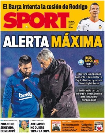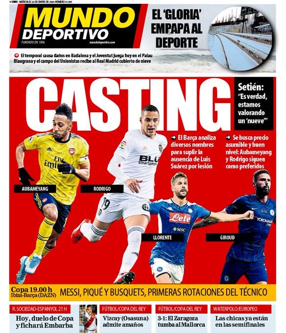 Sobre el partido ante el Ibiza, 'Sport' pone el foco en las ausencias y la climatología. Si Setién se quejó del viento y el césped del Camp Nou, no queremos ni imaginar lo que dirá tras disputar un partido en el estadio de un Segunda B. Pasen ustedes un feliz miércoles.