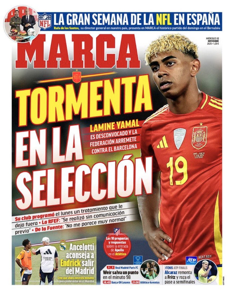 Marca habla de “tormenta en la selección” mientras Lamine parece asistir muy atento a las explicaciones del rotativo de Gallardo. Parece ser que hay guerra entre la Federación cuya estructura arbitral acogió a Negreira durante décadas y el club que lo tuvo en nómina durante al menos 17 años. Las trifulcas entre Jesse James y Billy el Niño, a fuer de ser sinceros, nos resbalan bastante. No nos motivan las batallas entre forajidos.