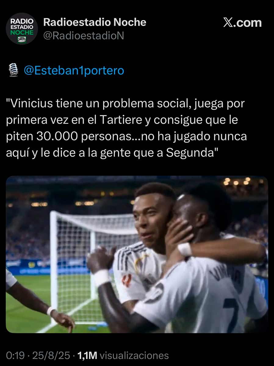 No es la primera vez que Esteban insulta a Vinícius. Lo que tenemos que hacer los madridistas es dejar escuchar aquellos medios que lo patrocinen.