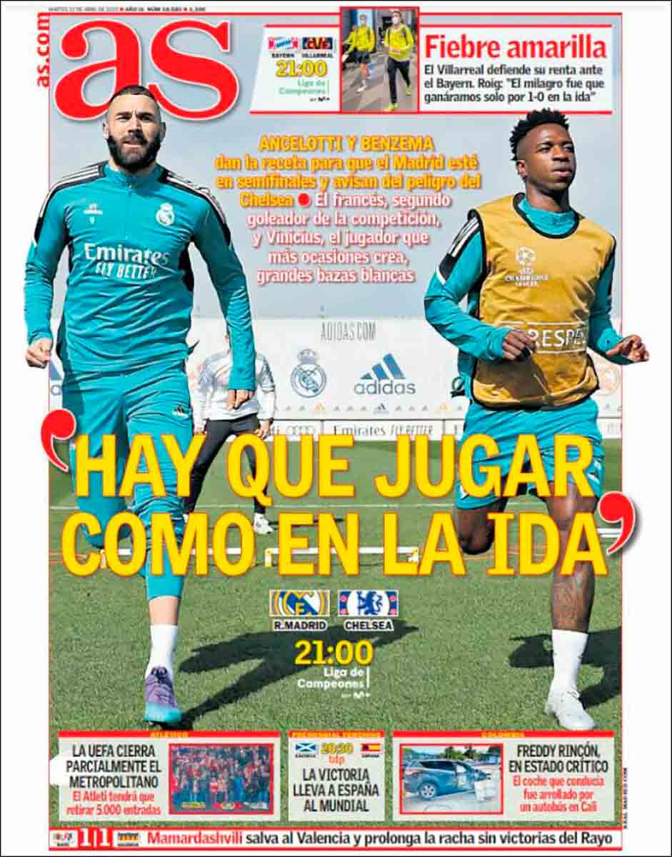 La portada de As opta por una fotografía del Dúo Dinámico (tal y como se refirió a ellos el CM del Real Madrid) de Concha Espina: Benzema y Vinicius. “Hay que jugar como en la ida”, titulan. Exacto, eso es lo que pensamos todos. El planteamiento de Ancelotti en el encuentro del pasado miércoles, quizá el mejor de la temporada, es el que esperamos todos los madridistas, no queremos ni oír hablar de experimentos absurdos como frente al Barça o actitud pasiva como la de París.
