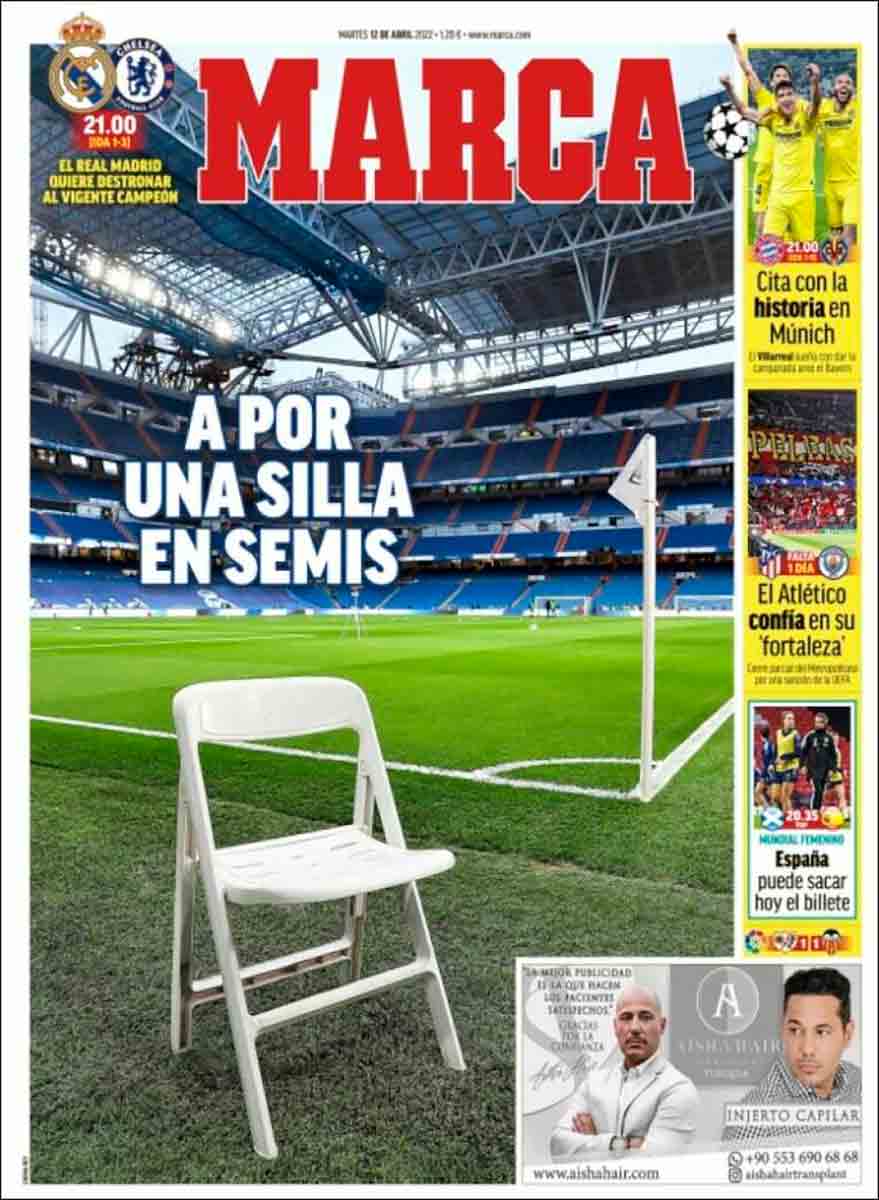 Marca se descuelga con una gran portada que no podemos más que alabar como merece. Titula “A por una silla en semis” sobre una imagen a ras de césped del Bernabéu con la ya mítica silla (o una prima hermana suya) de Alaba.