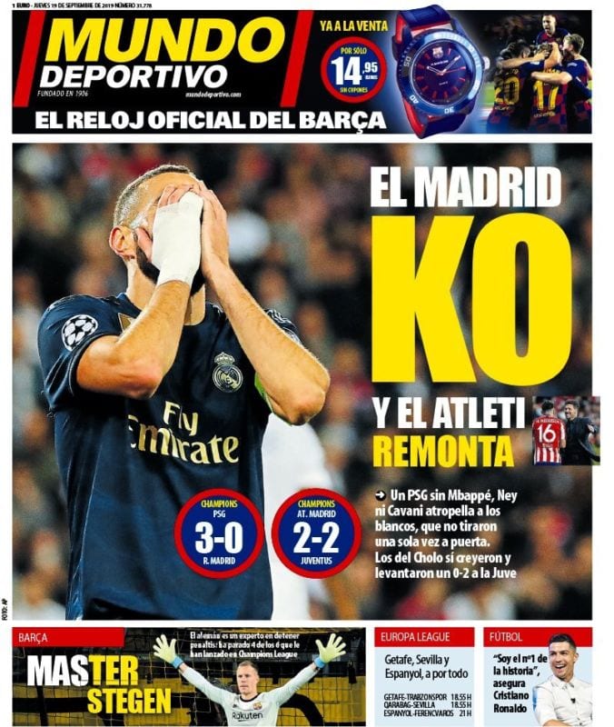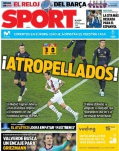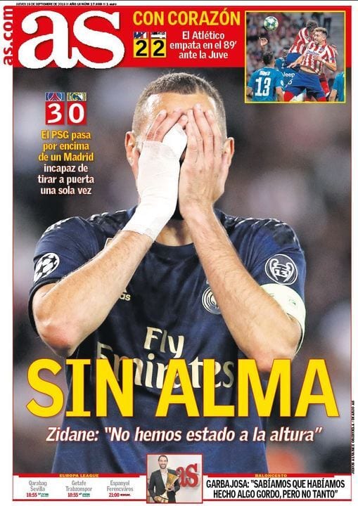 Las de hoy son portadas que merece el Real Madrid, y que se quedan hasta cortas. En el foro europeo, el que se le supone intrínsecamente suyo, el Madrid fue arrasado por un buen PSG menor, si cabe la paradoja, comandado por un Di María que se pasó la ley del ex, tanto en rendimiento como en la celebración de sus goles. El encuentro fue un suplicio, la nada hecha fútbol, y emitió un aroma de latente resignación. Es un Real Madrid desalmado en el sentido literal del término, sin alma, errático, menesteroso, nulo. Muy pocos jugadores se aproximaron mínimamente a su nivel (leed también las notas de Ramón). Es muy triste ver a nuestro equipo, el mejor de la historia del fútbol, incapaz de insinuar un amago de reacción ante la adversidad, ante la superioridad del rival, ante su propia desactivación. Las señales dadas ayer fueron altamente alarmantes y no se trata de un episodio aislado ni viene de ayer mismo. En el Real Madrid, perder tiene que ser grave. Perder sin oponer ninguna resistencia, firmando un partido que en fútbol fue peor al exhibido en otras grandes goleadas encajadas, ha de ser gravísimo, máxime si tiene lugar ante los ojos de todo el planeta. Como dijo Zidane al término del choque, hay tiempo para arreglar la situación, pero la pregunta es si hay medidas que puedan tomarse en ese tiempo y/o si hay voluntad de tomarlas. La situación debe ser analizada como crítica. Porque lo es. Y el horizonte de partidos ligueros que se presenta a corto plazo hace temblar al más pintado.