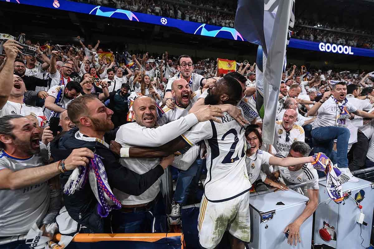 Y hay más. Porque, de algún modo, anticipa también el poeta lo que iba a ocurrir tan pronto como el árbitro señalara el final del partido, ese momento en el que todos buscamos con la mirada a Antonio Rüdiger para ver qué locura hace esta vez: “Nieva sobre el espejo de las celebraciones / y la nieve eterniza el festín de tus labios”. ¿Quién no ha besado —o ha sido besado— aleatoria y espontáneamente alguna vez a la más cercana y desconocida tras uno de esos goles-milagro del Real Madrid en las inenarrables eliminatorias europeas? Tengo para mí que grandes matrimonios han surgido con el gol merengue de la clasificación, y tal vez, algún que otro embarazo en plena prórroga; si bien no conservo prueba científica de esto último.