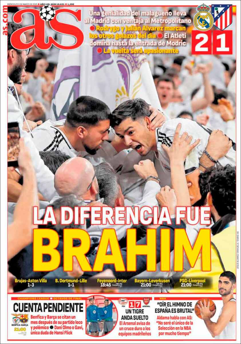 As viene a decir lo mismo que Marca, destacando a Brahim. Hermosa la foto del delantero fundiéndose en un abrazo con la grada, aunque no debería haberlo hecho porque le costó una amarilla. Dice As que “el Atleti dominó hasta la entrada de Modric”. Se ve que esos primeros 20 minutos arrolladores del Madrid los soñamos. Lo cierto es que la entrada de Modric ayudó al Madrid, dando más sentido a su juego y permitiéndole mandar en el tramo final del choque. El propio Luka tuvo la oportunidad de marcar un 3-1 que habría sido oro.
