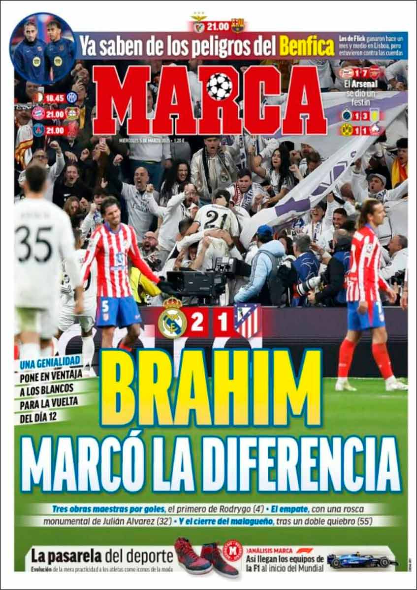 Marca dice que “Brahim marcó la diferencia” y tiene razón. El malagueño desequilibró el choque con una maniobra memorable y un astuto remate en área colchonera. Antes, sendos golazos de Rodrygo y Julián Álvarez habían establecido las tablas. Brahim fue el mejor del partido, aunque tampoco se puede decir que fuese injusto el MVP que la UEFA otorgó a Rodrygo. El brasileño, aparte de su tanto estratosférico, protagonizó las mejores acciones ofensivas del Madrid, le hicieron un penalti en el que Turpin se inhibió y se puso el mono de trabajo para esmerarse como el que más en el aspecto defensivo.
