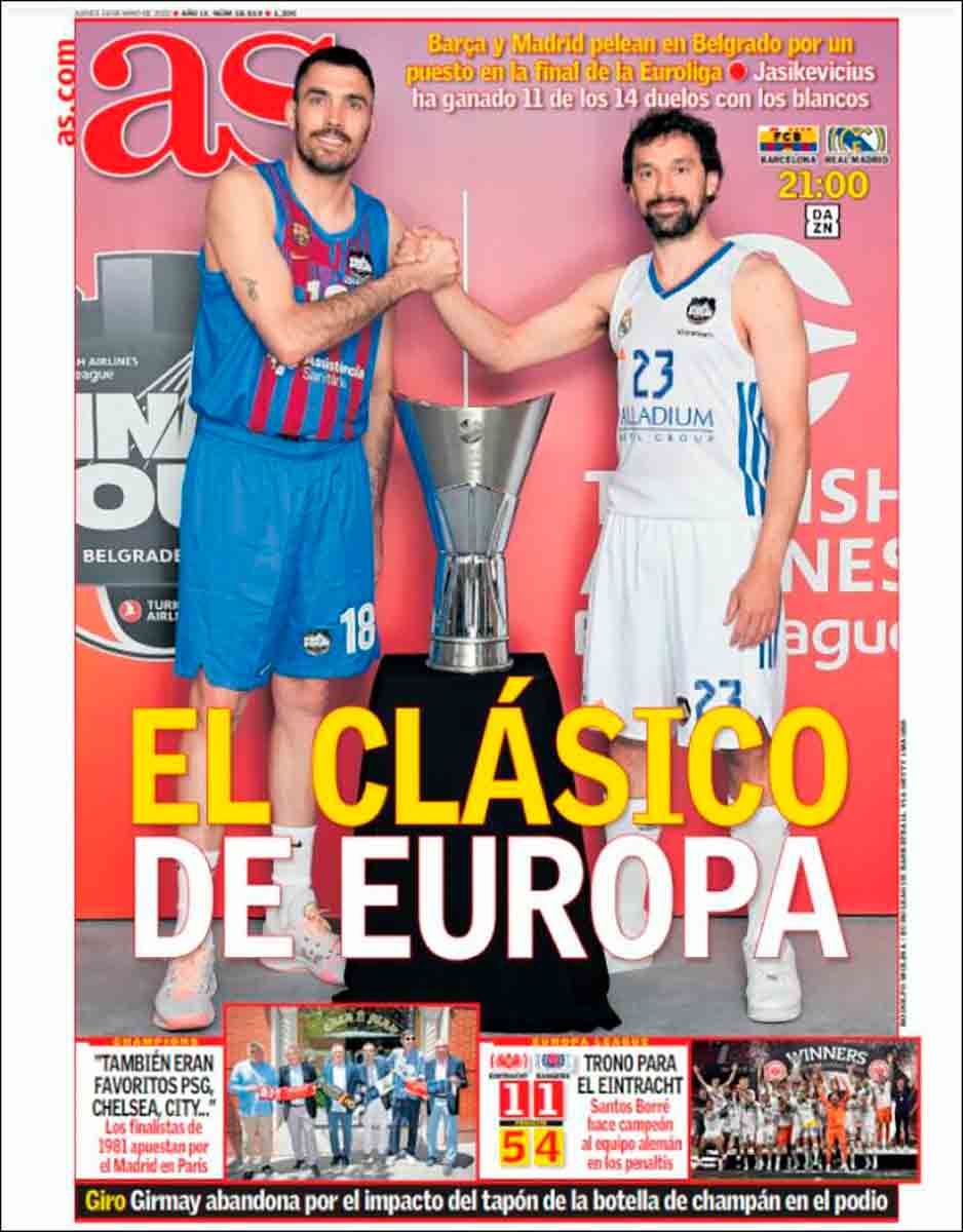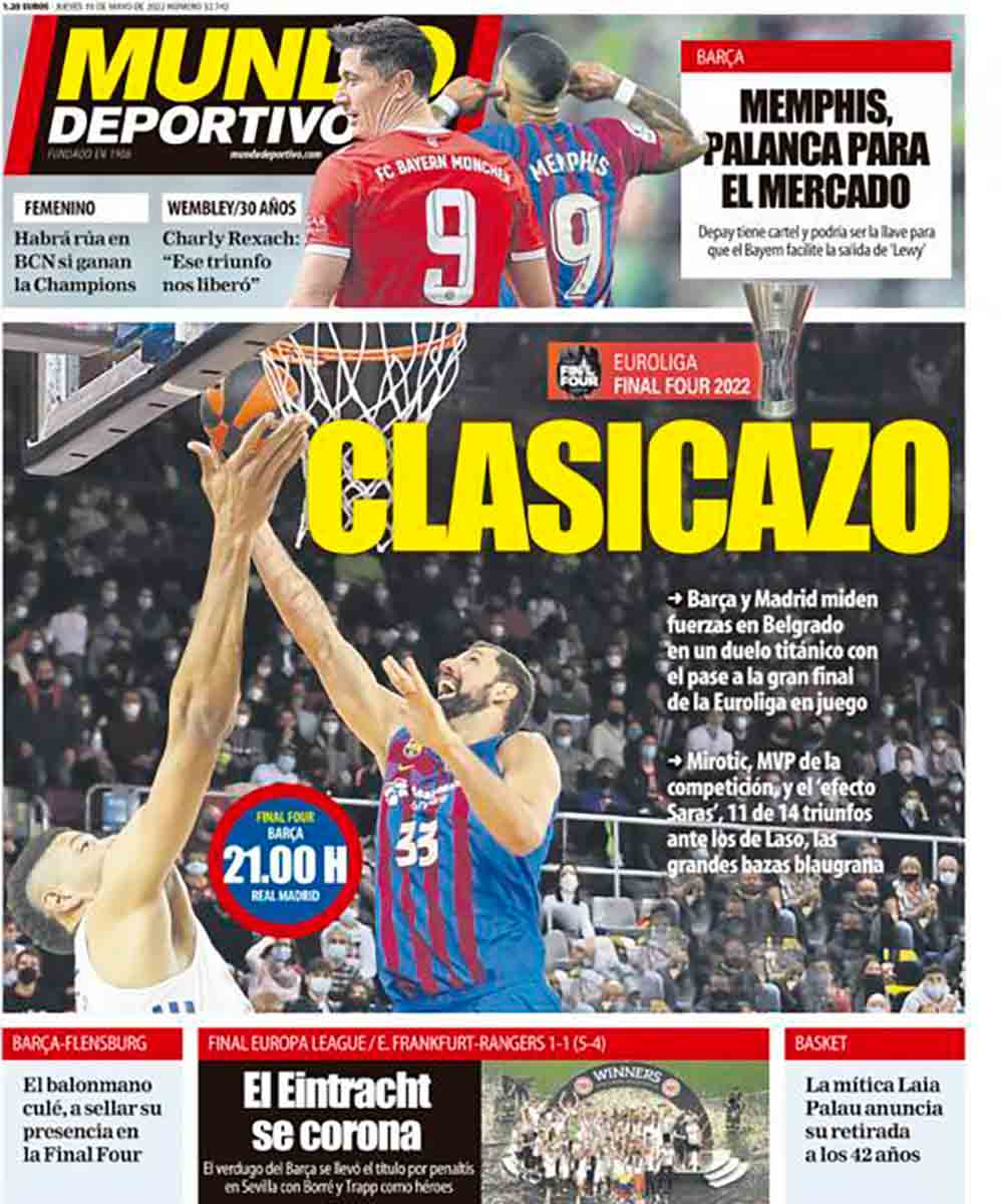 As y Mundo Deportivo dedican sus portadas precisamente a la semifinal europea entre Barça y Madrid de esta noche, refiriéndose a ella como clásico de Europa y clasicazo, respectivamente.