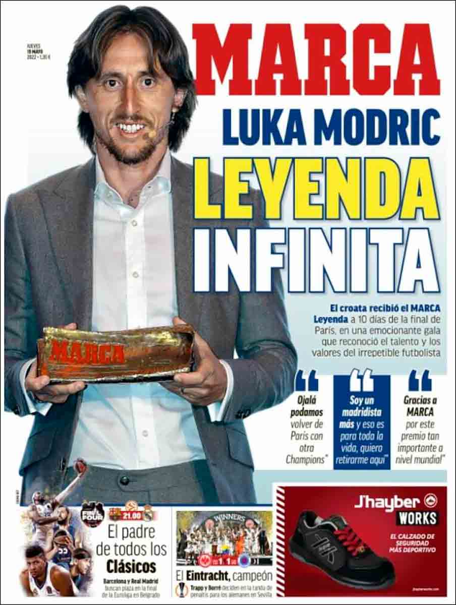 La portada de Marca sí que nos gusta. Efectivamente, más allá del premio Marca Leyenda concedido por el diario, Luka Modric es una leyenda infinita, como bien afirma el titular. Cuando hace unos años pensábamos: ¿qué sentirían aquellos madridistas de mitad del siglo pasado que vieron jugar a Di Stéfano, Puskas y Gento?, no imaginábamos que ya estábamos empezando a vivirlo nosotros en la figura —entre otros, por suerte— de Luka Modric. Gloria eterna al croata.