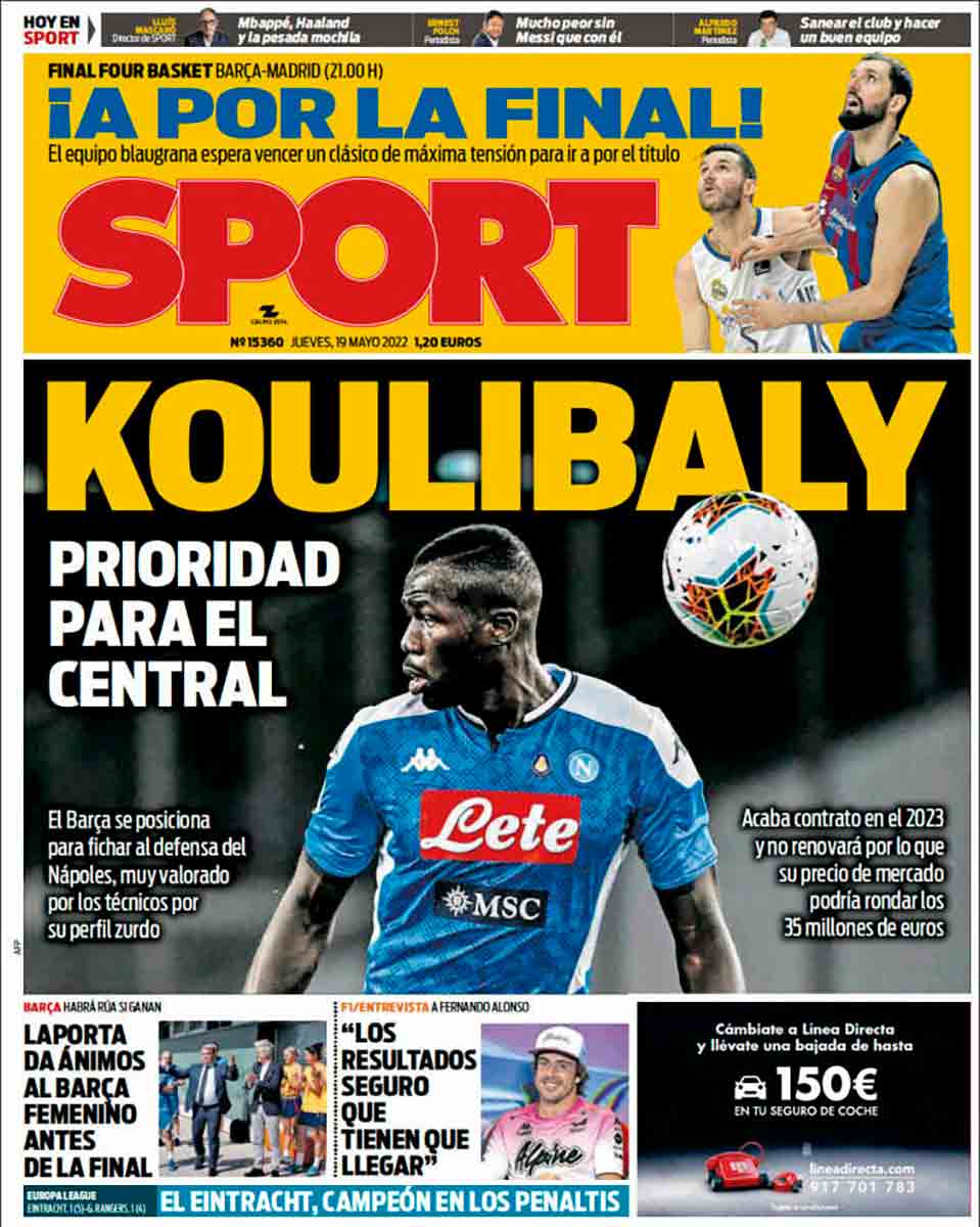 Más allá del descacharrante titular anterior de Sport, la portada se la dedica a su amigo de Balay. Perdón, a Koulibaly, el central del Nápoles. Ya sabéis que Sport es un diario que se caracteriza por llevar cada día en su frontispicio la foto de un futuro —según ellos— fichaje del Barça. Si se hubiesen cumplido las predicciones de Sport, el Barcelona ya habría fichado a toda la población mundial excepto a Kimi Räikkönen y a una señora de Pastrana que vive en una calle muy empinada.