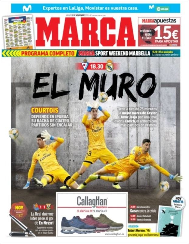 El diario Marca aprovecha la conmemoración de los 30 años de la caída del Muro de Berlín y nos sorprende trayendo a la portada un hecho positivo acerca de nuestro equipo: una racha de cuatro partidos consecutivos sin encajar goles que le obliga a grafitear una loa indisimulada al guardameta que cubre la portería. El belga Courtois, tan vilipendiado en otras ocasiones, ahora acompañado por grandes letras: